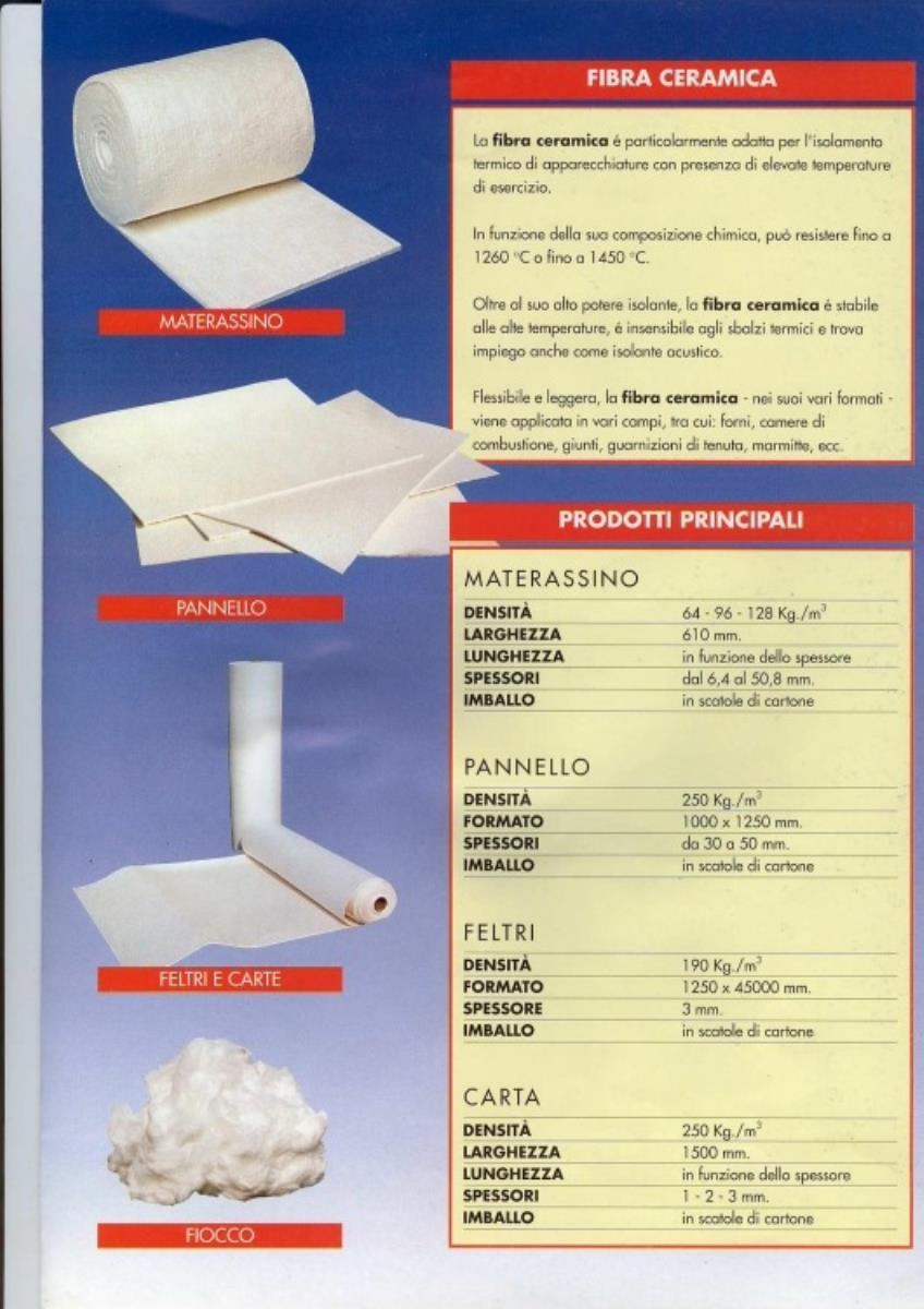 Questi materassini sono prodotti partendo da fibre Ceramiche centrifugate, fibre di cui posseggono le caratteristiche di inerzia chimica. Nessuno di questi materassini contiene leganti e tutti sono agugliati sui due lati. Il potere di assorbimento termico è decisamente superiore a quello dei prodotti refrattari o isolanti normali. La varietà di spessori e densità disponibili permettono, per ogni applicazione, di sfruttare al meglio le caratteristiche d’isolamento di questi materassini.